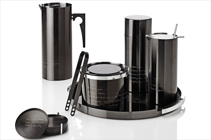 Paul Smith除了运用擅长的鲜艳色彩帮不锈钢水壶换上新把手,也用黑色钛金属设计出整套包含鸡尾酒调酒组合,还印上幽默小标语,在不改变外型下为产品注入活泼新生命,在法兰克福家具展上大受好评。