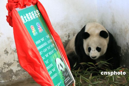 2007年12月30日,济南动物园,公园管理部门和社会爱心捐助大熊猫的单位等一起为“美女大熊猫”20号举行隆重的征名揭牌仪式。这只于当年9月28日落户济南、谱系号为20号的卧龙大熊猫获得昵称“泉泉”,富有济南特色,象征着她在泉城的美好生活。 被誉为四川卧龙一号美女大熊猫的20号目前在济南生活良好,社会各界先后为她起了数千个昵称,经过选拔,最终“泉泉”获得一致通过。 中新社发 乐悠 摄