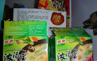 第3分钟:这个时候水差不多就煮沸了,于是绝招上场了。这就是我能在五分钟中之内完成这个奇迹的秘诀了——家乐浓汤宝!