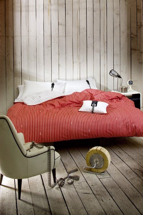 牛仔世界不可或缺的一大风格,可以用Diesel一词来概括。这个设计的主要特点是拉链,一条条拉链排列成条纹背景,错视画派的动感式样象征着青春朝气的世界。靠垫上夸张的拉链图案,则代表了Diesel牛仔裤的历史标签。