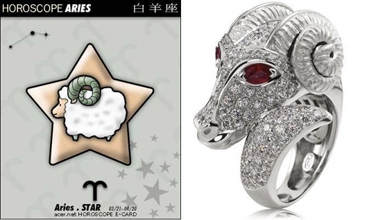 属于火象星座的白羊座,全身充满精力,斗志高昂。这款戒指以闪烁的碎钻镶成戒身,隐喻着白羊火一般的强烈热情,弯曲盘旋的羊角旨在强调白羊百折不挠的进取精神,戒圈内的珠状设计更是赋予了白羊一颗七窍玲珑心。