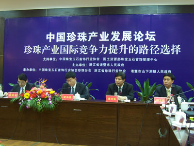 2008年4月18日,由中国珠宝玉石首饰行业协会、国土资源部珠宝玉石首饰管理中心主办的中国珍珠产业发展论坛在诸暨市会议展览中心隆重举行。本次会议的目的是为淡水珍珠行业诊脉,总结珍珠产业发展现状,分析珍珠产业存在问题,共同探讨破解珍珠产业发展瓶颈的策略,寻求提升珍珠产业国际竞争力的路径。