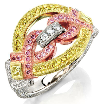 粉红钻石稀有,只占每年世界钻石生产总数的0.01%,造型设计较为简单,所以不少首饰设计师喜欢并合粉红钻与蓝、黄等不同颜色的钻石,设计出款式缤纷、变化多端的钻饰。