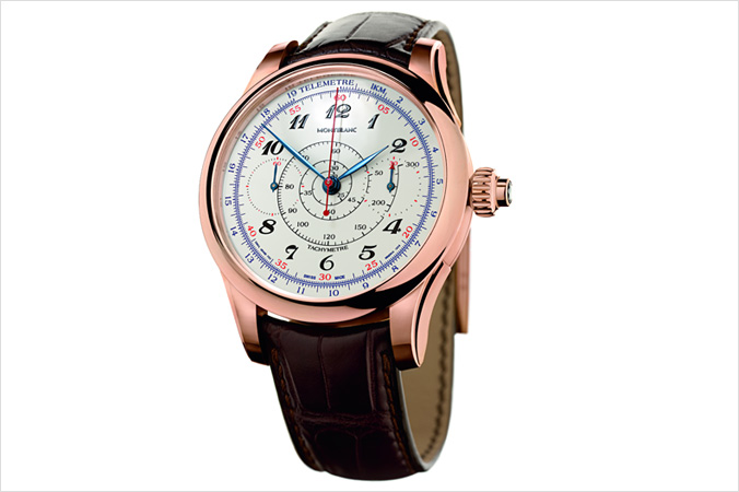 万宝龙维莱尔1858系列复刻计时表的表盘有螺旋形测速计刻度,令人联想到上世纪初至三十年代期间美耐华表厂(Minerva)经典计时表的风貌。美耐华表厂的档案室收藏了大量当年的珐琅表盘,其表面有不同量度功能的刻度,例如部份表盘专为帆船赛腕表而设,其它则有脉搏计或数量计,而部份表盘刻度更可计算百分一秒计时。