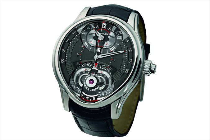万宝龙维莱尔1858系列最新一员:ExoTourbillon Chronographe (陀飞轮计时表)拥有创新技术改良,规范指针式表盘有中置分针、偏离中心的两地时间小时盘(连日夜显示)、小秒针及30分钟定时器,而最叫人侧目的当数置于陀飞轮外面的摆轮,其尺寸比陀飞轮框架还要大。