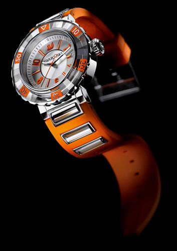 六颗透明仿水晶均匀地点缀于亮丽耀目的橘色橡胶表带,而每颗仿水晶均是以最顶尖的技术精心镶嵌,与融入放射纹设计的切割仿水晶表圈完美配衬。多面切割表耳与扣针式表扣,以及刻有Swanflower 图案的表壳,均是施华洛世奇独有的设计元素,也令这系列表款与众不同且易于识别。