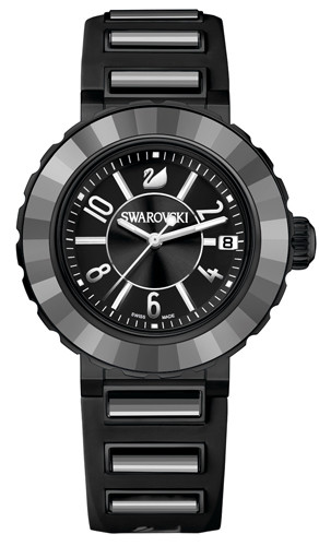 “Dresstime” 手表揉合优雅风格、女性魅力与精确雕琢,犹如首饰般独特美丽,也是这个全新系列的耀眼新星之一。这款手表以都市建筑为灵感,呈现出由水平与斜线或平面组成的设计风格。不锈钢表带以线形动态,搭配H形设计元素与12颗瑰丽雅致的黑矿色多面切割仿水晶。侧边设有开关的不锈钢表带,提供舒适灵活的佩戴体验。表盘完美搭配了十二颗仿水晶,中央为展现放射纹图案的黑色磨砂设计,另以人手镶嵌11颗透明仿水晶石,作为优雅动人的刻度显示,与12点位置的施华洛世奇天鹅标志互相辉映。指针凸显切割工艺的非凡魅力,更表现出这款手表的超卓性能,以及具备防刮损的蓝宝石玻璃镜面设计特色。