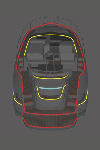 这个设计稍微牺牲了一些速度游艇的水动力学特性换来了更多的沐浴阳光的空间,提供了一个宽敞的甲板,一个大空间的船舱和更多的可以享受日光浴的空间。