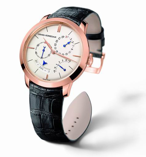 在40毫米玫瑰金表壳衬托下,创新功能布局让显示更加清晰;棒形时标、幼叶形指针和各显示器分布有致,准确无缺地指示日历和时差数据;机芯由GP芝柏表厂自家研制,功架十足,是名表收藏家梦寐以求的精品。