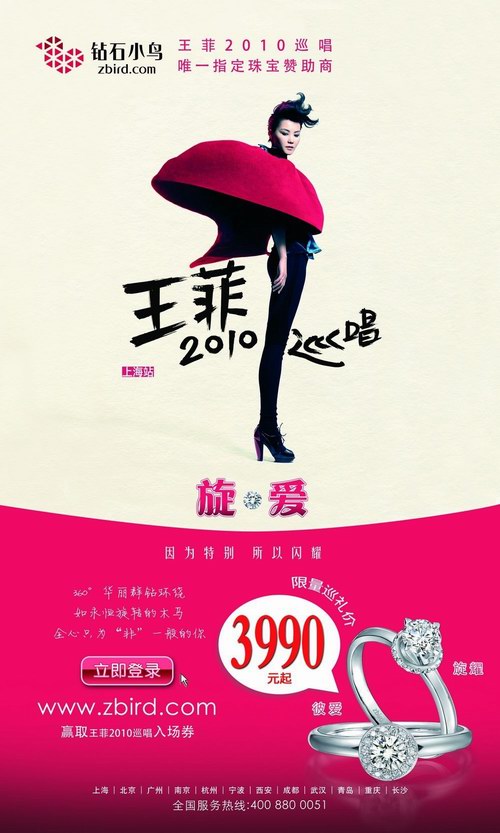 为了回报菲迷们的热爱,在11月15日~11月24日期间预购“旋•爱”成功的消费者还可免费获赠王菲2010演唱会纪念版明信片一份,更有机会抽取王菲2010上海演唱会门票,与天后一起分享爱的传奇。钻石小鸟官网论坛以及官方微博同期将举行“旋•爱”征文比赛,参与其中的网友即可获赠王菲2010上海演唱会精美限量版纪念礼品。更多菲一般的精彩,即刻登录Zbird.com抢先体会吧!