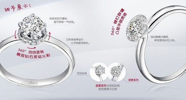 作为王菲2010巡唱唯一指定珠宝赞助商,钻石小鸟特别推出了“旋•爱”系列限量版钻戒套装产品,其灵感来源于天后王菲一首耳熟能详的歌曲“旋木”,璀璨的群钻就像旋转的木马围绕主钻,轻轻拨动戒指下面精美的群钻环,它会围绕主钻闪闪转动,交相辉映,如同木马始终围绕它的轴心爱人不停的转动。本季“旋•爱”的乐章,充分表达了挚爱环绕,永恒守护的爱情誓言。